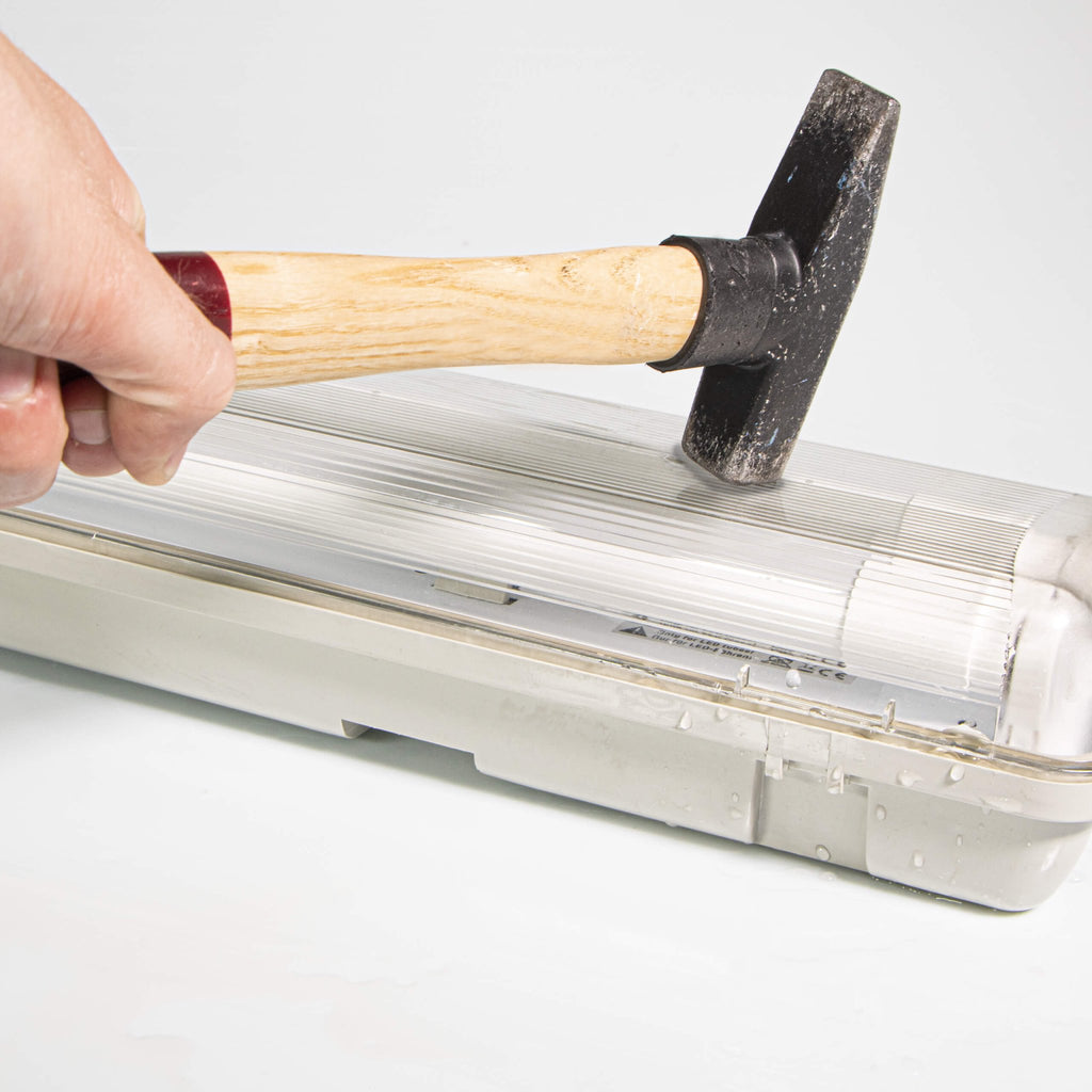 Diese Leuchte verfügt über ein robustes Polycarbonatgehäuse und ist mit den erforderlichen Schutzarten ausgestattet. Sie ist staub- und strahlwasserdicht und kann daher problemlos in Feuchträumen und sogar im Außenbereich installiert werden. Die doppelten Proventa-Leuchten sind zudem besonders stoßfest (IK08).